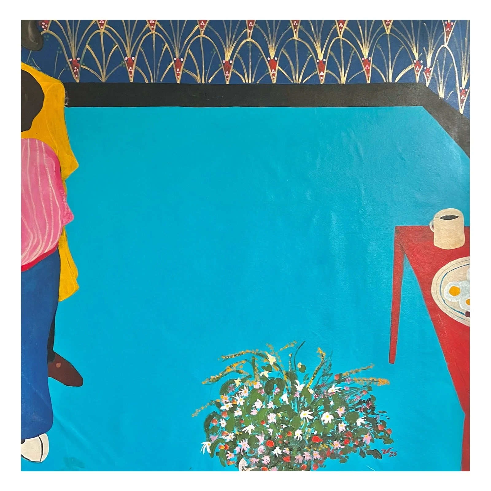 A series of large figurative paintings set inside rooms with wallpaper featuring things like doughnuts, chairs, flowers and even eggs!